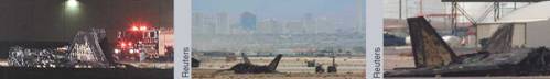 Вверху: F/A-22A №4014 готовится к очередному ночному полету на авиабазе Неллис Внизу: обломки того же самолета на ВПП родной авиабазы после аварии 20 декабря 2004 г.