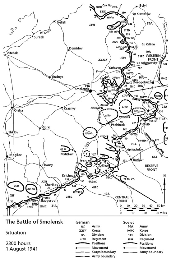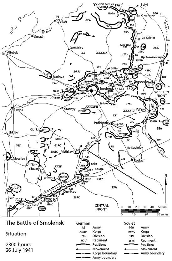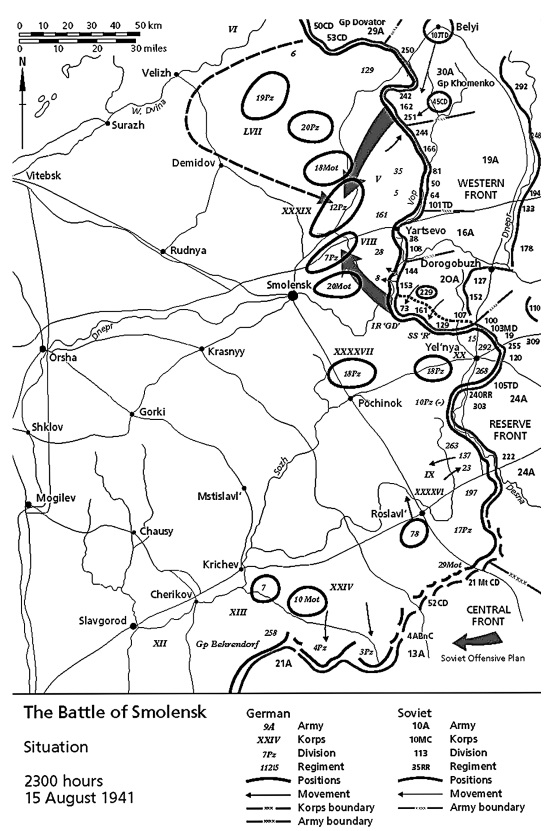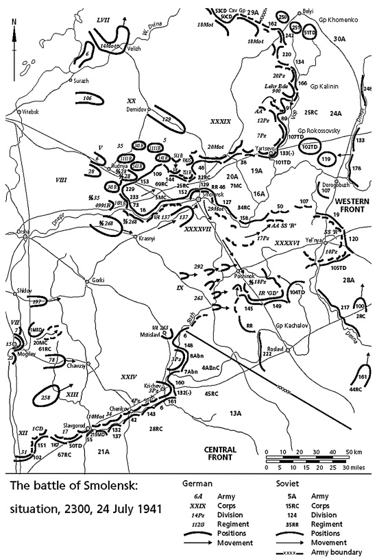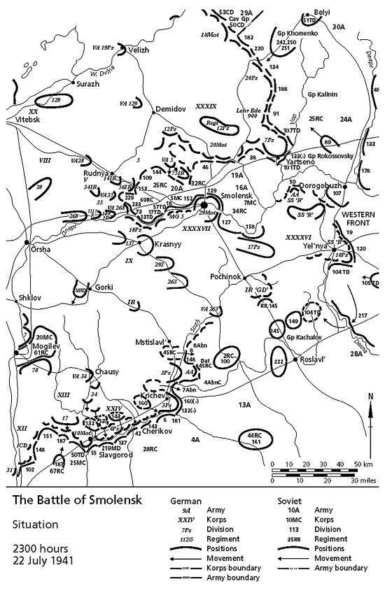 В двадцатых числах июля советские войска нанесли сразу несколько ударов в районе Смоленска, причем эти удары были проведены корпусными боевыми группами. (Вообще красиво звучит: Korps-Abteilung Rokossovsky, Korps-Abteilung Khomenko, Korps-Abteilung Kachalov. – Прим. пер.) К сожалению, атаки этих наспех сколоченных соединений успеха не имели, максимум того, что им удалось достичь, – затормозить продвижение 3-й танковой группы севернее Смоленска, и то ненадолго.