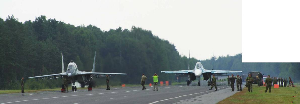 Впервые отработка посадок, а затем и взлетов с аэродромных участков автодорог в ВВС Республики Беларусь была выполнена чуть более года назад, в апреле 2007 г. (см. «Взлёт» №5/2007, с. 17). Тогда к этой задаче привлекались два учебно-боевых штурмовика Су-25УБ из состава 206-й штурмовой авиабазы, дислоцирующейся на аэродроме «Лида». Один самолет пилотировал экипаж в составе заместителя командующего ВВС и войсками ПВО РБ – начальника авиации генерал-майора М. Левицкого и командира 206-й ШАБ полковника И. Голуба, а второй – заместитель командира 206-й ШАБ полковник А. Зимин и заместитель командира эскадрильи майор В. Слободской. Получив практическое подтверждение готовности экипажей, самолетов и самой автодороги к отработке уникальной операции по внеаэродромным взлетам и посадкам реактивной боевой техники, командование ВВС Республики Беларусь приняло решение расширить эксперимент и привлечь к нему и сверхзвуковые истребители.