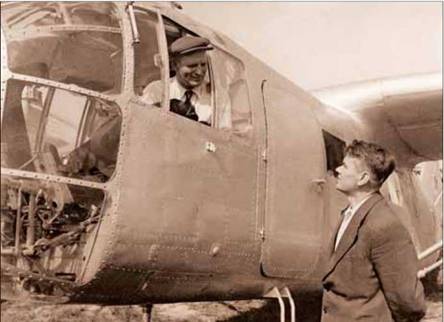 К.И. Пономарев (в кабине) и И.П. Братухин у вертолета Б-1. Измайлово, 1948 г.