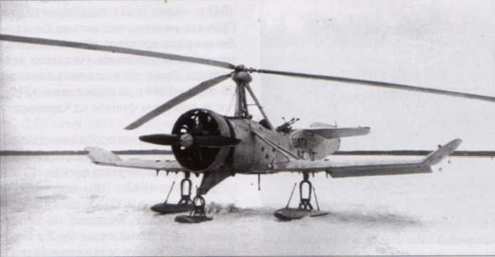 Несколько слов стоит сказать об автожире А-7, разрабатываемом конструктором Камовым с 1931 г. Автожир представлял собой небольшой самолет с укороченным взлетом за счет верхнего винта. Максимальная скорость его составляла 221 км/с, минимальная – 53 км/ч. Время полета – 2,5 ч. Экипаж – 2 человека. Автожир даже имел три 7,62-мм пулемета: ПВ-1, стрелявший через винт, и оборонительную спаренную установку пулеметов ДА (Дегтярев-авиационный). Осенью 1941 г. пять А-7 принимали участие в боях в составе 24-й армии в районе Ельни.