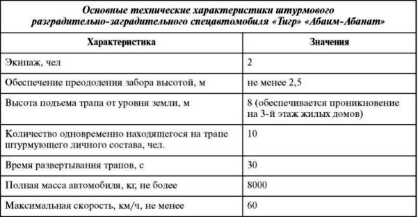 При проведении спецопераций на трапе спецавтомобиля «Тигр» могут находиться одновременно до 10 вооруженных спецназовцев, а полное время развертывания трапа составляет не более 30 секунд Для обеспечения безопасности бойцов штурмовых групп в комплекте спецавтомобиля «Абаим-Абанат» имеются штурмовые пуленепробиваемые щиты. Они могут закрепляться на краю трапа, либо находиться в руках у штурмующих.