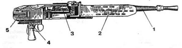 1 — ствол; 2 — короб; 3 — приемник. 4 — спусковой механизм; 5 — гнездо для привода троса