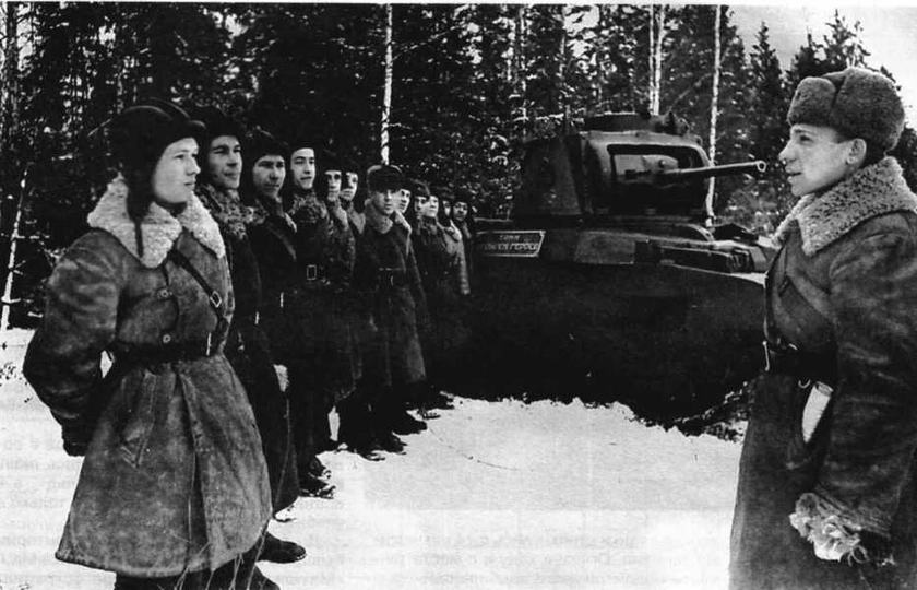 Танк "четырех героев" и его экипаж. Слева направо: ст. лейтенант Н.И.Фокин, ст. лейтенант А.И.Войтов, ст. сержант П.К.Гладких и ст. сержант С. Т. Дорожкин в строю с однополчанами