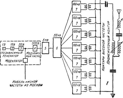 Режим четвертого каскада все время меняется, потому что именно здесь, на этот каскад, поступают пришедшие по кабелю из Москвы и усиленные колебания — звуковой частоты и здесь же происходит их наложение на колебания высокой частоты.