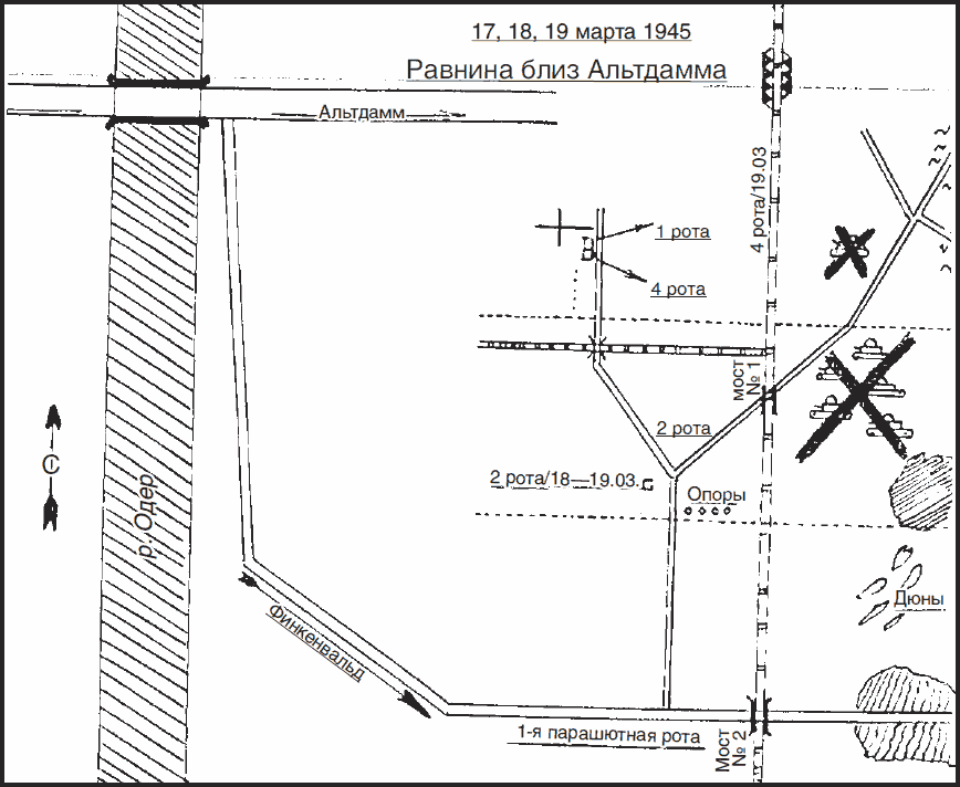 Диспозиция четырех валлонских рот во время боев у Альтдамма (ныне в черте польского Щецина), 17–19 марта 1945 г. (из архива Э. де Брина, взято у Р. Деверси)