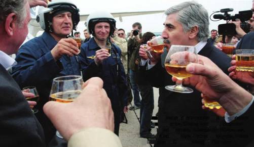 Бокал шампанского после первой посадки «Суперджета». Слева направо: старший летчик-испытатель Александр Яблонцев, летчик-испытатель Леонид Чикунов, глава компании «Сухой» Михаил Погосян