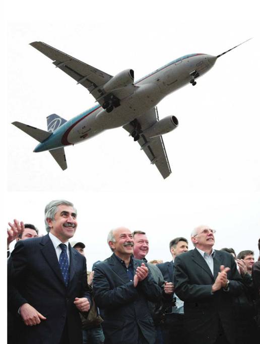 "Суперджет" в воздухе! Слева направо: генеральный ,директор АХК «Сухой» Михаил Погосян, начальник ЛИК ЗАО «ГСС» Рубен Амбарцумян, генеральный директор ЗАО «ГСС» Виктор Субботин, начальник ЛИК АХК «Сухой» Александр Зудилов
