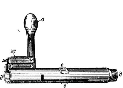 Для закрывания при выстреле казны ствола служил затвор дд (рис. 77), представлявший цилиндрическую трубку с двумя стойками жж на заднем конце и двумя боевыми выступами ее; между стойками помещалась рукоять з (рис. 78), вращавшаяся на оси и, проходящей через стойки; в своем поднятом (рис. 77) и опущенном (рис. 75) положений рукоять закреплялась помощью особых пластинчатых пружин; боевые выступы ее предназначались для соединения затвора со ствольной коробкой; при повороте затвора они входили в соответствующую выемку в ствольной коробке, удерживая затвор при выстреле, подобно тому как это выполняется выступами боевой личинки в современной 7,62-мм винтовке; в передней части затвора помещалась подвижная головка к, под которой было несколько кожаных кружков; они имели целью устранение прорыва пороховых газов при выстреле, (подобном тому, как это было сделано в винтовке Шасспо (см. рис. 76).