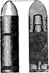 Патрон к винтовке Карле (рис. 79) состоял из бумажной гильзы, пули системы Минье, заряда пороха и поддона, изготовлявшегося из нескольких кружков картона; в поддон вставлялся капсюль; при выстреле передняя часть гильзы обрывалась у перевязи под пулей и уносилась ею из ствола; остальная же часть гильзы с поддоном оставалась в каморе патронника. Остаток этого продвигался вперед при вкладывании следующего патрона, а при выстреле выбрасывался из канала ствола впереди пули.