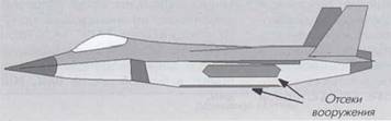 В центральной нижней части фюзеляжа, между каналами воздухозаборника планируется сформировать грузоотсек с двумя створками, способный вмещать четыре ракеты класса "воздух-воздух" средней дальности. По одной ракете малой дальности предполагается разместить в двух боковых малообъемных грузоотсеках.