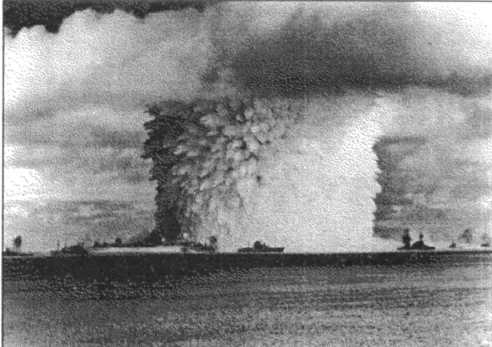 1 июля 1946г. - начата операция Crossroads. Операция предусматривала провести испытания по определению влияния атомного взрыва на военно-морские корабли и проводилась на атолле Бикини (Bikini Atoll) в Тихом океане. Во время первого испытания бомба была сброшена с самолета В-29 и подорвана на высоте 30.000 футов (9.150м) от поверхности воды. Корабли располагались в лагуне. В результате 5 из них затонули, а 9 других получили тяжелые повреждения. Следующий взрыв был произведен 25 июля был произведен на поверхности лагуны. После него число затонувших кораблей достигло 32. В этих испытаниях принимали участие авианосцы Saratoga (CV 3) и Independence (CV 22).