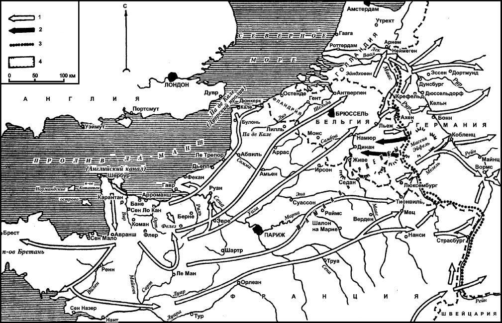 Рис. 13. Западный театр военных действий в 1944–1945 гг. 1 – наступление союзников в 1944–1945 гг.; 2 – контрнаступление немцев в Арденнах в декабре 1944 г.; 3 – «линия Зигфрида»; 4 – плацдарм союзников в Нормандии к концу июня 1944 г.