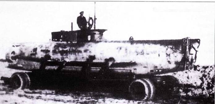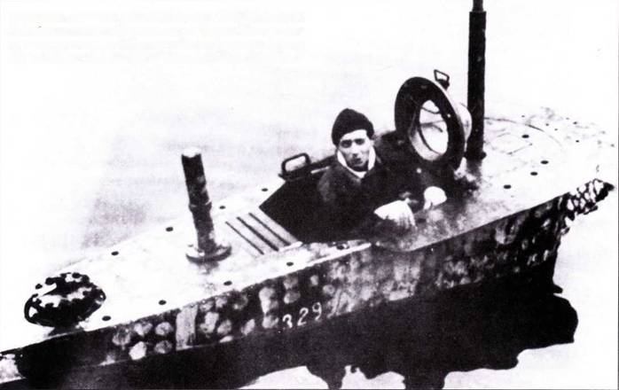 Сверхмалая подводпая лодка U-5329 типа XXVII В5 Seehund. Из рубки высунулся лейтенант цур зее Ульрих Мюллер, вторым членом экипажа субмаринки был лейтенант-инженер Юрген Нейман, снимок сделан 7 февраля 1945 г. в Юмуйдене.