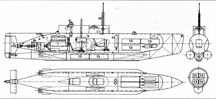 I. ДВС. 2. Сцепление. 3. ЭД. 4. Тахометр. 5. Постоянное сцепление. 6. Подшипник. 7. Дейдвудпая труба. 8. Воздухозаборник. 9. Компас. 10. Перископ. 11. Баллоны с кислородом. 12. Баллоны со сжатым воздухом. 13. Аккумуляторные батареи.