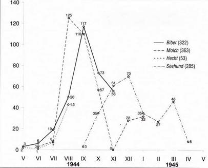 В конце войны в Германии проектировали еще несколько типов малых подводных лодок, с помощью которых надеялись переломить ход войны. Анализируя эти проекты, можно утверждать, что никаких шансов на успех они не имели. До высадки союзников па континент Германия располагала всего тремя лодками типа «Biber» и двумя лодками типа «Hecht». Правда, в дальнейшем выпуск лодок стремительно нарастал, как это можно увидеть на графике. Параллельно с выпуском лодок шла подготовка экипажей.