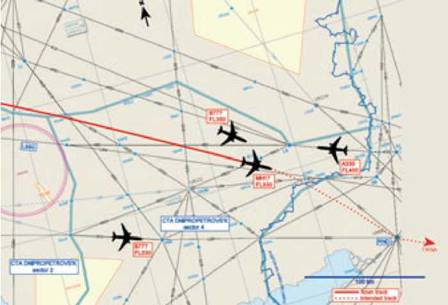 Воздушная обстановка в зоне ответственности Днепропетровского центра УВД на 13.20 UTC 17 июля 2014 г. Красной линией показана пройденная часть маршрута рейса MH17, красным пунктиром – планировавшаяся и согласованная с диспетчером. На карту нанесено также фактическое положение на этот момент времени трех других коммерческих авиалайнеров, находившихся в данном районе, с указанием их типа и эшелона