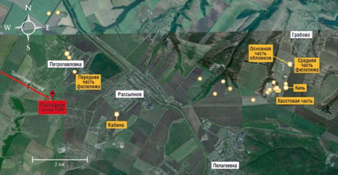 Схема разброса групп фрагментов конструкции самолета и последняя зафиксированная бортовым самописцем FDR точка его нахождения