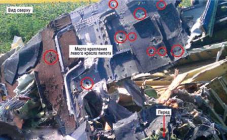 Повреждения элементов носовой части фюзеляжа и кабины экипажа соответствуют повреждениям, которые можно было бы ожидать от большого количества объектов с высокой энергией, проникших в самолет извне.