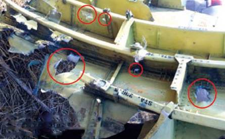 Фрагмент обшивки носовой части фюзеляжа под остеклением фонаря кабины экипажа с многочисленным количеством небольших отверстий от внешнего проникающего воздействия