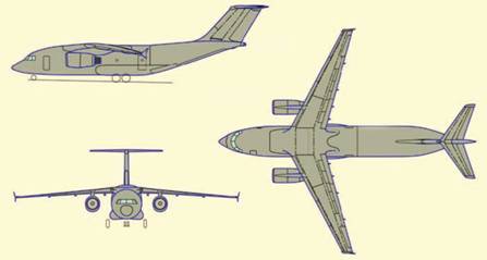 Идея создания грузовой версии пассажирского Ан-148 возникла еще несколько лет назад. Первый и самый простой вариант — грузовой Ан-148С на 10 т груза с большим боковым грузолюком по левому борту хвостовой части фюзеляжа. Такая машина предпочтительна для коммерческих авиаперевозчиков, однако малопригодна для военных. Поэтому следующим шагом стала проработка рампового транспортного самолета Ан-148Т. Диаметр фюзеляжа у него оставался неизменным — 3,35 м, но хвостовая часть подлежала радикальной переработке для размещения кормовой рампы. В грузовой кабине с поперечным сечением 2,4х2,4 м могли бы размещаться грузы общей массой до 13,5 т. Возросшая до 45 т взлетная масса требовала применения более мощных двигателей — например, модифицированных Д-436Т2 тягой по 8200 кгс, а в перспективе — двигателей нового поколения АИ-28.