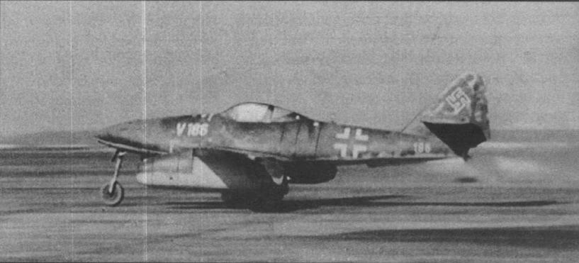 В начале 1945 г. особое внимание уделялось разработке ракетного варианта самолета, так называемого "Защитника дома", способного очень быстро выходить на высоту перехвата. Первый из них – Me 262С-1а был переоборудован из Me 262А-1а (N9 130 186) и полетел 27 февраля 1945 г. под управлением Гер- да Линднера. Me 262С-1 был оснащен ракетным двигателем "Вальтер" R II- 211/3 (HWK 509), установленным в хвостовой части фюзеляжа. Т-топливо заливалось в передний 900-л бак, а С- топливо – в задний 600-л. Топливо для Jumo 004В заливалось в задний основной 900-л бак и в передний дополнительный на 170 л.