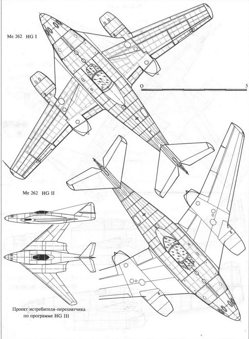 Одновременно с работами над Me 262 инженеры и конструкторы фирмы Мессершмитт продолжали вести исследования, направленные на создание реактивных самолетов следующего поколения. При этом основной упор был сделан на качественное улучшение их аэродинамики и, в первую очередь, на установку стреловидного крыла. Подобных проектов было несколько. Некоторые из них представляли собой глубокую модернизацию Me 262, другие были совершенно отличными от него (однако и в том и в другом случае Me 262 использовался в качестве летающей лаборатории). Так, в ходе разработки и постройки легкого одномоторного реактивного истребителя Мессершмитт Р1101 на Me 262 испытывались воздухозаборник и воздушный канал, обеспечивающие подвод воздуха к двигателю, установленному под хвостовой частью Р1101. Немаловажную роль Me 262 сыграл и как базовая конструкция при создании сверхскоростных самолетов со стреловидным крылом по программе HG (Hochgeschwindigkeit – высокоскоростной). Здесь уместно вспомнить уже упоминавшийся ранее Me 262 V9 с приплюснутым фонарем пилотской кабины и вездесущий Me 262 V056. Очередным шагом стал HG I, переделанный, по нашим данным (в зарубежной литературе утверждается, что HG I есть ни что иное, как Me 262 V9) из серийного истребителя и отличавшийся стреловидным оперением и наплывами на центроплане. Следующим шагом стал Me 262 HG II (март 1945 г.), на котором кроме стреловидного оперения было установлено и стреловидное крыло. Машина была построена и подготовлена к летным испытаниям.