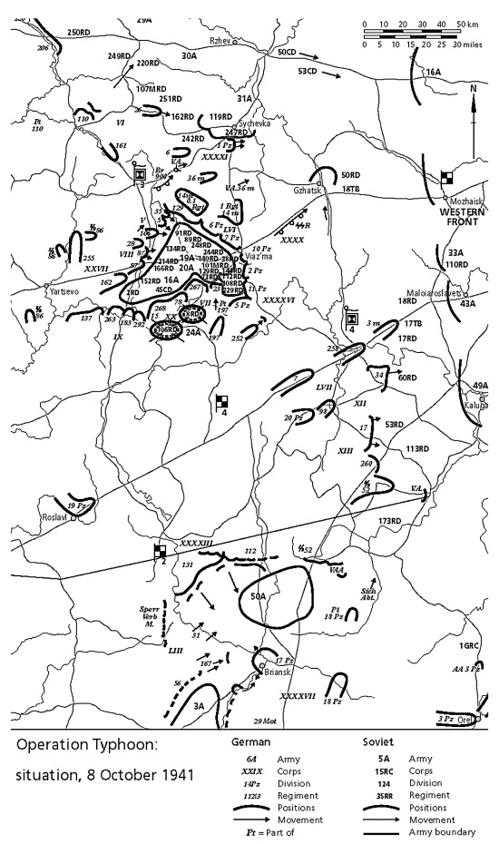 3 октября положение советских войск резко ухудшилось. XXIV корпус с ходу взял Орел, а дивизии XLVII корпуса подошли к Карачеву, оказавшись в глубоком тылу советских 3-й и 13-й армий. Генерал Еременко попытался остановить их, бросив в атаку две стрелковые дивизии, но им удалось лишь слегка затормозить продвижение немцев. К этому времени 2-я армия, воспользовавшись прорывом 4-й танковой группы, начала наступать на Жиздру, охватывая северный фланг Брянского фронта – 50-ю армию. К 6 октября на фронте совершенно отчетливо начали вырисовываться контуры катастрофы.