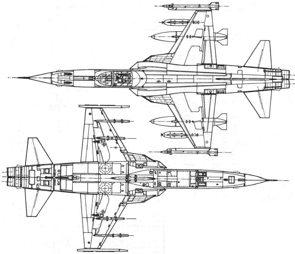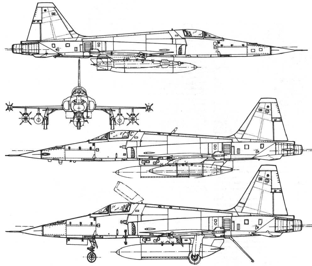 Задача создания F-5E оказалась сложнее. Одна из важнейших причин выбора для модернизации именно F-5, как мне кажется, заключается в том, что в США в 60-е годы не было на вооружении «чистых» истребителей. Попытка модернизации «Фантома» под истребитель маневренного воздушного боя (модификация F-4E) ожидаемого успеха не принесла. Несмотря на высокие летно-технические характеристики, лучшую тяговооруженность, мощное вооружение и современное РЭО, этот самолет был недостаточно маневренным, сложным в управлении и дорогим. Поэтому F-5A «Фридом Файтер» – простой, дешевый, надежный в эксплуатации, с хорошими характеристиками устойчивости и управляемости – более других подходил для выбранной цели. Однако изменения, внесенные в конструкцию самолета при модернизации, были значительными: