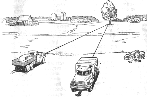 Переправившись, первый автомобиль с помощью того же троса буксирует второй автомобиль. Таким же образом на труднопроходимой переправе можно перетащить прицеп. При переправе колонной автомобили могут преодолевать брод, сцепившись друг с другом в виде поезда (рис. 15). Для сцепки лучше использовать жесткие буксиры.