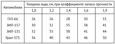 Толщины льда, необходимые для переправы отечественных автомобилей высокой проходимости с полной нормальной нагрузкой в кузове (допустимой для грунтовых дорог), приведены в табл. 9.