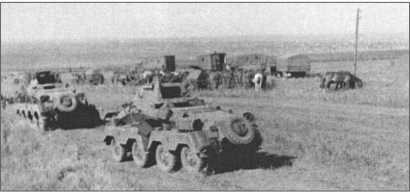 Восьмиколесный разведывательный автомобиль 13-й танковой дивизии во время остановки в Ногайской степи. Все люки открыты, чтобы хоть как-то охладить внутреннее пространство разведывательной машины.