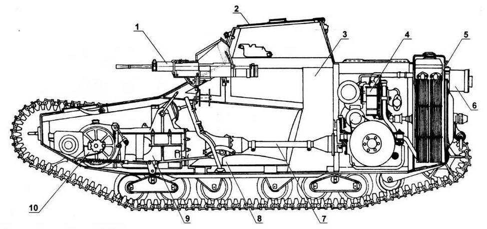 1 — спаренный пулемет Fiat 35; 2 — посадочный люк; 3 — топливный бак; 4 — двигатель; 5 — радиатор; 6 — глушитель; 7 — карданный вал; 8 — сиденье механика-водителя; 9 — коробка передач; 10 — механизм поворота