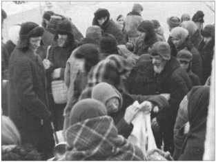 Русское гражданское население, укутанное в теплую зимнюю одежду, на рынке одного русского города. Много купить там все-таки было нельзя.