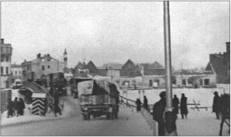 Зима 1941/42 года в Нарве: немецкий караульный домик стоит перед въездом на мост. Грузовики пробиваются вперед по обледеневшей дороге.