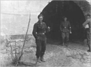 Фельдфебель Гюнтер Хердер из 3-й роты 29-го танкового полка в расслабленной позе перед одними из городских ворот Нарвы.