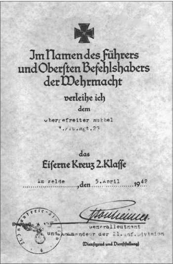Железный крест 2-го класса был вручен Альфреду Руббелю, когда он еще был обер-ефрейтором, 5 апреля 1942 года.