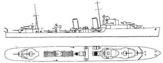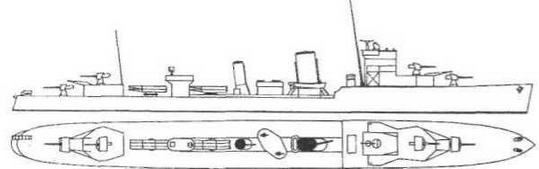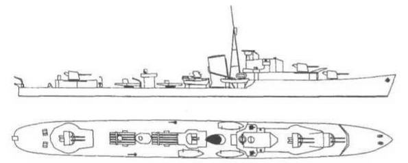 Вооружение: 4 120-мм орудия MK-IX, 2 40-мм орудия, 1 12-мм пулемет, 2 четырехтрубных 533-мм торпедных аппарата, параваны, 3 бомбосбрасывателя, 6 глубинных бомб.