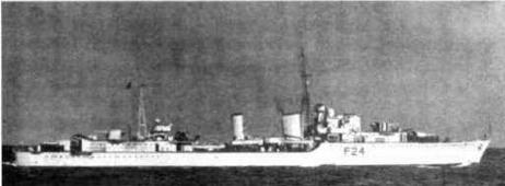 "Ambuskade". В июле 1943 года демонтирован "Хеджехог", вместо него установлен прототип "Скуид". Также пришлось убрать с корабля носовой торпедный аппарат, 76-мм орудие и уложить 65 тонн балласта.