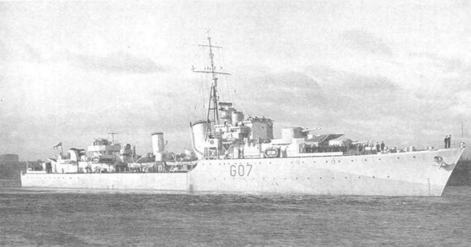"Dunkan". Предвоенная служба проходила в китайских водах. После начала войны возвращен в воды Метрополии. 17 января 1940 года столкнулся с торговым судном, получив при этом серьезные повреждения. После ремонта с середины 1940 года находился в составе Гибралтарского соединения "Н". В мае 1942 года участвовал в захвате острова Мадагаскар. В конце года вернулся в Англию для прохождения модернизации. После завершения работ становится флагманом эскортной группы "В-7" под командованием капитан 2 ранга П. Греттона. Группа "В-7" бьша одной из самых удачливых противолодочных групп. В иностранной литературе ее часто называют "легендарной". В 1943-1945 годах эсминец эскортирует атлантические конвои. На его счету числится подводная лодка"и 381" (по другим данным, пропала без вести), потопленная 19 мая 1943 года, и поврежденная в тот же день "U 707" и "U 274", поврежденная 23 октября 1943 года.