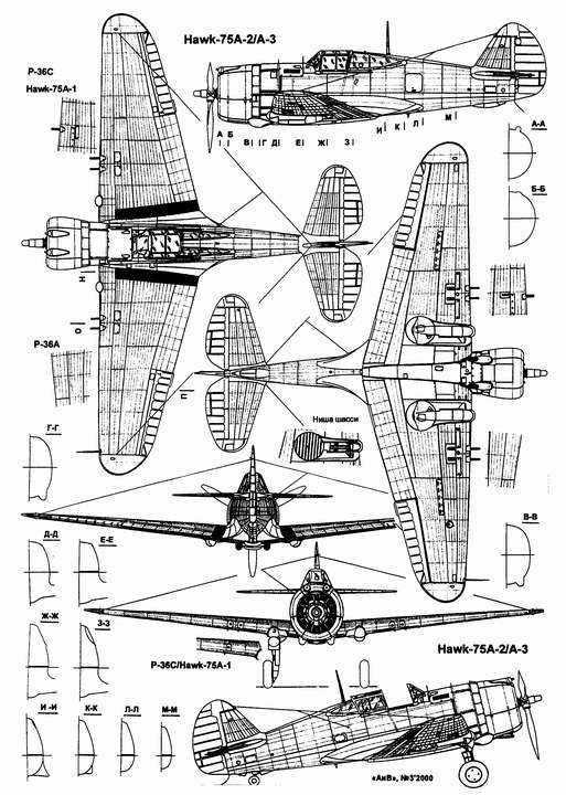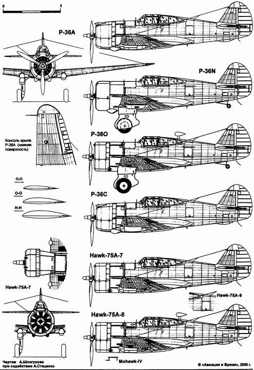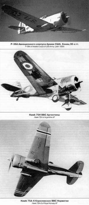 Буэнос-Айрес приобрел лицензию на выпуск еще 100 машин, однако на заводе в г. Кордоба построили к июлю 1942 г. всего 20 единиц, служивших до 1955 г. – Curtiss Hawk 75P – серийный Р-36А, оснащенный двигателем V-1710-19 в 1150 л. с. и послуживший прототипом Р-40 (см. ниже). – Curtiss Hawk 75Q – не более двух 75М, которые должны были собрать в Лой-Вине, однако достроили в Буффало. Оснащались двигателями R-1820-G105A в 1200 л. с. и усиленным вооружением. – Curtiss Hawk 75R – экземпляр для испытаний двигателя R-1830-2C2G мощностью 1200л. с. – Curtiss Hawk 75S (ХР-42) – опытный экземпляр для испытаний нового капота двигателя R-1830-31. – Curtiss Hawk 75A-1 – 100 машин для ВВС Франции. Установлены: двигатель R-1820-SC3G в 1050л.с. (подр. данным – В-1830-8ССв950л. с.), 2 синхронных и 2 крыльевых 7,5-мм пулемета (последние на некоторых самолетах отсутствовали), французское приборное и радиооборудование. Заказ выполнен в декабре 1938 – апреле 1939 гг., при этом 18 готовых истребителей поставлено морским путем, а остальные 82 собраны во Франции из американских агрегатов. 6 трофейных машин в 1941 г. немцы поставили в Финляндию. – Curtiss Hawk 75A-2 – партия для ВВС Франции с двигателем R-1830-SC3G в 1050 л. с. и усиленным крылом для размещения четырех 7,5-мм пулеметов.