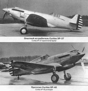 Продолжая совершенствовать «Хок-75», Берлин обратил внимание на двигатель жидкостного охлаждения Allison V-1710. Несмотря на относительно небольшую мощность, его установка на уже отработанный планер позволила уменьшить лобовое сопротивление самолета, что дало заметный прирост скорости. Результаты заводских испытаний прототипа ХР-37 и войсковых опытной серии из 13 YP-37 вполне удовлетворили командование USAAC. Еще более перспективным выглядел ХР-40, который впервые поднялся в воздух 14 октября 1938 г После установки двигателя V-1710-33 в 1100 л. с., переноса радиаторов из-под средней части фюзеляжа в носовую и др. доработок самолет окончательно завоевал симпатии генералов. Вариант получил фирменное обозначение Curtiss Hawk 81 и военное – Р-40 Warhawk. 27 апреля 1939 г. USAAC заказал в Буффало 524 самолета, после чего началось серийное производство. Самолеты выпускались в следующих модификациях: – Р-40 или P-40-CU (фирменное обозначение Curtiss Hawk 81). Вооружение состояло из 2-х синхронных 12,7-мм и 2-х крыльевых 7,62-мм пулеметов. Взлет головного образца состоялся 4 апреля 1940 г. Заказ был сокращен до 199 единиц и выполнен 15 октября 1940 г. Франция заказала 10 мая 1939 г. 185 машин, получивших обозначение Н81-А1 и отличавшихся наличием четырех крыльевых пулеметов. Ко времени капитуляции заказчик не успел получить ни одного самолета, а построенные 142 экземпляра поступили в RAF, где получили обозначение Tomahawk Mk. I. – Р-40А – один серийный P-40-CU, переоборудованный в фоторазведчик. – Р-40В (фирменное обозначение Curtiss H81-B). Отличался наличием четырех 7,62-мм крыльевых пулеметов, бронеза-щитой летчика и топливной системы, а также более совершенным радиооборудованием. Поставлен 131 ВВС Армии США (USAAF) в январе-апреле 1941 г. Для RAF построено 110 самолетов, получивших обозначение Tomahawk Mk. II и НА (Curtiss Н81-А2), на которых пулеметы и радиооборудование были заменены на британские образцы. Из этой партии 23 машины поступили в СССР. – Р-40С (фирменное обозначение – как у Р-40В). Сокращена емкость крыльевых топливных баков и введено их протектирование, установлены: дополнительный бачок для горючего, новая радиостанция и держатели для бомб калибром до 227 кг. В марте-мае 1941 г. поставлено USAAF 193 истребителя. В ноябре 1940 – августе 1941 гг. RAF получили 328 Tomahawk Mk. IIB (H81-A2 и A3), из них 49 позже были переданы СССР и 100 – Китаю для вооружения Американской Добровольческой группы. – P-40G – гибрид фюзеляжа P-40-CU и крыла Н81-А2. Собрано 43 экземпляра, из которых 16 отправлены в СССР.