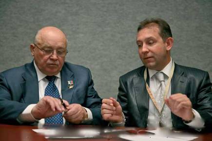 Генеральный директор ОАО «Вертолеты России» А.Б. Шибитов и Генеральный конструктор фирмы «Камов» С.В. Михеев во время подписания протокола о намерениях о передаче 5 вертолетов Ка-62 Нарьян-Марской авиакомпании