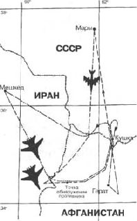 После того, как Як-28 снизился в районе разведки, с КП ПВО передали, что с иранской авиабазы Мешхед взлетела пара и направилась туда же. Вскоре она тоже снизилась и, как наш разведчик, пропала с экранов РЛС. На КП притихли, но докладывать никуда не стали. Росляков и Габидулин отработали там минут 20, конечно же, нарушили границу, как и предполагалось, на 3-4 км, после чего стали возвращаться вдоль дороги Гуриан-Герат. Шли они на высоте 600 м, попутно ведя разведку. Через 5-7 минут летчик посмотрел влево и заметил тень от самолета. Еще через минуту он глянул вправо - там была еще одна тень! Резко обернувшись, Росляков увидел в 70-100 м пару F-14 с подвешенными ракетами. Ни слова не говоря штурману, он бросил самолет к земле и, прижавшись к ней, на высоте 10-20 м на максимальной скорости стал уходить в сторону Герата. Для Габидулина столь резкие эволюции стали полной неожиданностью - он спокойно готовился к разведке в следующем районе и складывал в свой портфель карты, которые теперь разлетелись по кабине. "Что делаешь?!" -закричал штурман по СПУ*, но в ответ услышал только одно: "Молчи, молчи!!". (Летчик решил не оставлять следов встречи с "неприятельскими" истребителями на самолетном магнитофоне.)