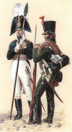 Обер-офицер 1-го флотского батальона Балтийского флота в парадной форме. 1802–1803 гг. Мушкетер батальона полковника Гамена 3-го морского полка в походном снаряжении во время Ганноверской экспедиции 1805 г. Рисунок художника А.Ю. Аверьянова. 2002 г.