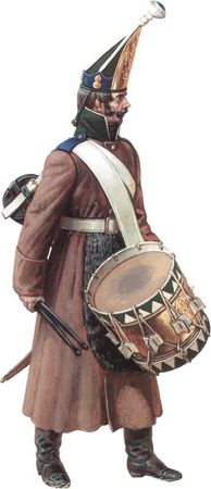 Ротный барабанщик гренадерского батальона генерал-майора Говорова 4-го морского полка в зимней форме. 1803–1807 гг. Рисунок А.Ю. Аверьянова. 2002 г.