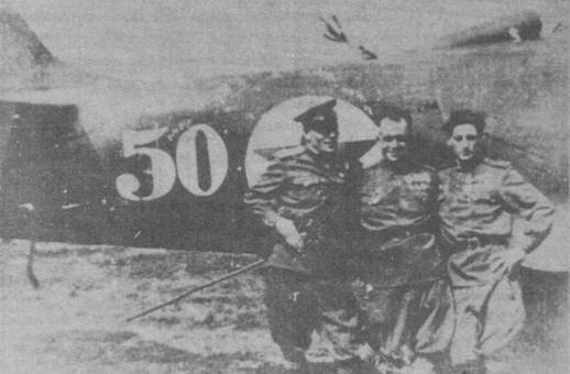 У самолета справа налево: В. Березкин, К. Сухов, И.Руденко. Звезда в белом круге