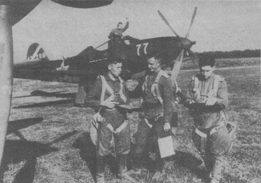 Командир 1 эскадрильи ст.лейтенант А.И. Свистунов, командир 2 эскадрильи ст.лейтенант Н.В.Стройков и командир звена лейтенант М. И.Орлову P-39Q-25 NB 44-32386 Н.В.Стройкова.
