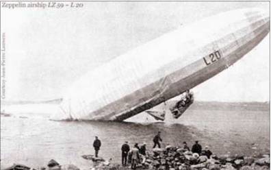 «Цеппелин» L-20 после налета на Лондон 4 мая 1916 г. Этот дирижабль в ходе двух боевых вылетов на Англию сбросил около 3 т бомб
