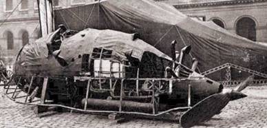 Цеппелин L-49, сбитый 20 октября 1917 г. и его моторная гондола. Этот дирижабль выполнил один налет на Англию, сбросив 2 т бомб